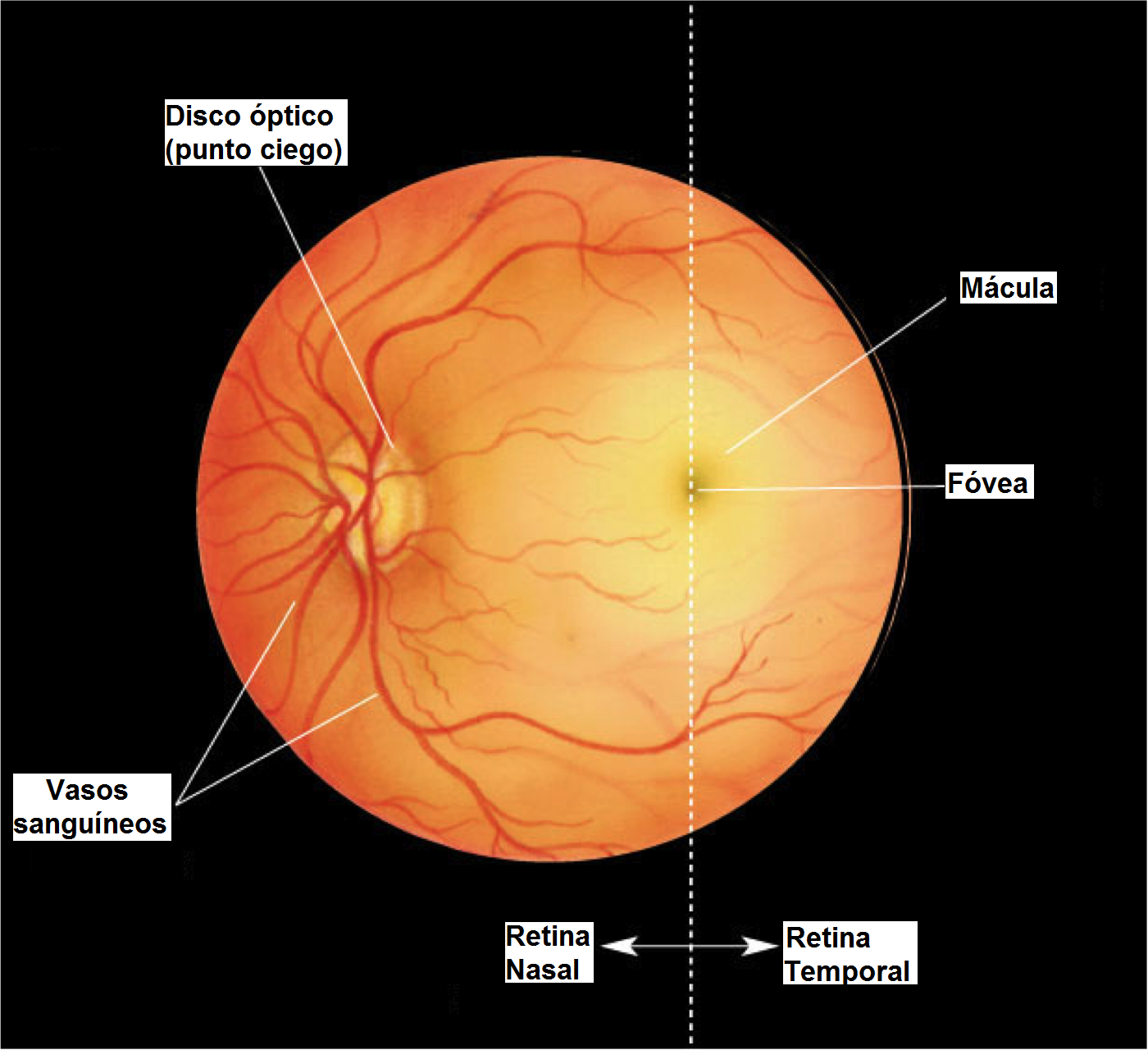 En la zona posterior de la porción óptica de la retina se distinguen varias estructuras importantes. La papila óptica o disco óptico es la región donde las fibras provenientes de las neuronas de la retina forman el nervio óptico que va hacia el cerebro. Posee una coloración más clara que la de la retina adyacente y sobre su superficie se observa la salida de la arteria central de la retina y sus ramificaciones en los vasos que irrigan la retina. Se conoce también como punto de la retina ya que carece de fotorreceptores sensibles a la luz. Usando los dos ojos juntos, uno puede ver el mundo visual completo, dado que dichos campos visuales se solapan (el punto ciego del ojo derecho puede ser visto por el ojo izquierdo y viceversa).