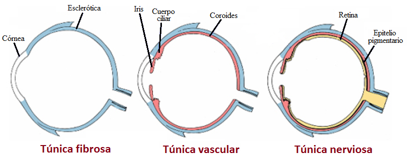 Cada ojo está compuesto en sus paredes por varias capas membranosas, también llamadas túnicas concéntricas, que forman un conjunto de membranas envolventes. La nomenclatura para definir cada capa es variada, pero se refiere a la posición que ocupa o la composición principal de cada una. Éstas son la túnica fibrosa (capa más externa), la túnica vascular (o media) y la túnica nerviosa (capa interna), las cuales se representan esquemáticamente en la siguiente figura.