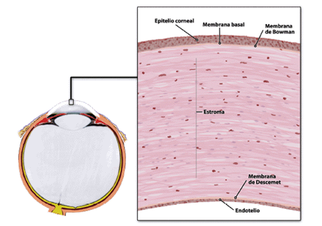A nivel microscópico, se puede ver que la córnea se compone de una estructura en múltiples capas, distinguiéndose 5 capas principales, desde la superficie hacia el interior: