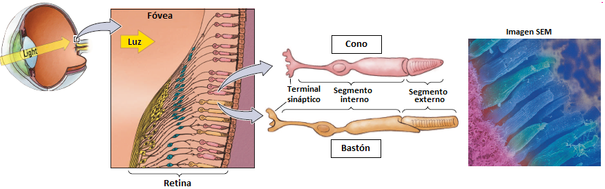 Las células receptoras y las neuronas de la retina realizan algunas funciones sorprendentes. Estas traducen la luz en potenciales de acción, discriminan longitudes de ondas con lo cual nosotros podemos distinguir colores, y trabajan en un rango de intensidades de luz muy amplio, desde muy brillante a muy oscuro. Hay principalmente dos tipos de receptores en la capa receptora, conos y bastones, esencialmente llamados así por su forma. El segmento externo de las células receptoras contiene moléculas con pigmentos visuales sensibles a la luz llamadas opsinas. Una representación de los conos y bastones junto con una imagen SEM de los mismos puede verse en la siguiente figura.