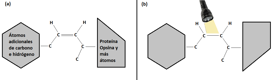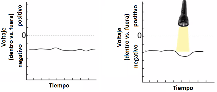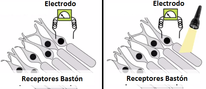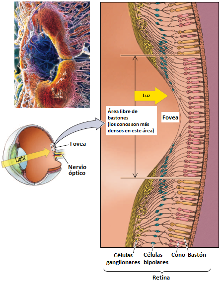 Como ya se dijo, los foto-receptores convierten primero la energía lumínica en energía química y después en actividad neuronal. Cuando la luz alcanza un foto-receptor, se dispara una serie de reacciones químicas que conducen a un cambio en el potencial de membrana. Los bastones y conos no están igualmente distribuidos sobre la retina. La fóvea tiene sólo conos, pero su densidad decae dramáticamente a ambos lados de la fóvea. En la siguiente figura, se representa la fóvea y la distribución de receptores. Esta organización es la razón por la cual nuestra visión no es tan aguda a los bordes del campo visual.