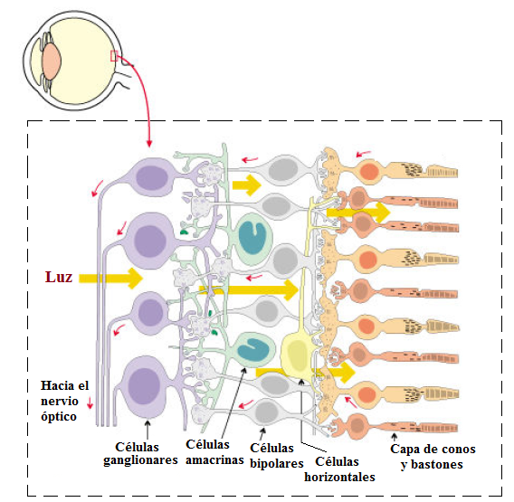 En el camino desde los conos y bastones hacia el cerebro, la primera capa contiene tres tipos de células: células bipolares, células horizontales y células amacrinas. Las horizontales y las amacrinas son células de vínculo, que enlazan los fotoreceptores con las células bipolares y con la segunda capa neural, respectivamente. Esta segunda capa está formada por las células ganglionares de la retina, cuyos axones se unen formando un manojo hacia el disco óptico y abandonan el ojo para formar el nervio óptico. Estas células difieren de acuerdo a con cuál célula neuronal están conectadas: las llamadas células M o magnocelulares, que reciben su entrada principalmente de los bastones y son por lo tanto sensitivas a la luz pero no al color; y las células P o parvocelulares, que son sensibles al color recibiendo su entrada de los conos mayormente. Las células M se encuentran por todas partes en la retina, incluyendo en la periferia, donde somos sensibles al movimiento pero no al color o a los detalles finos. Las células P se encuentran en gran medida en la región de la fóvea, donde somos sensibles a los colores y los detalles finos (Kolb y colaboradores, 2005).