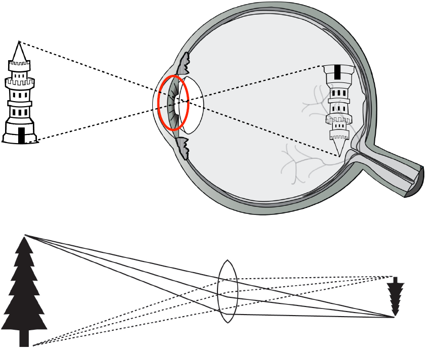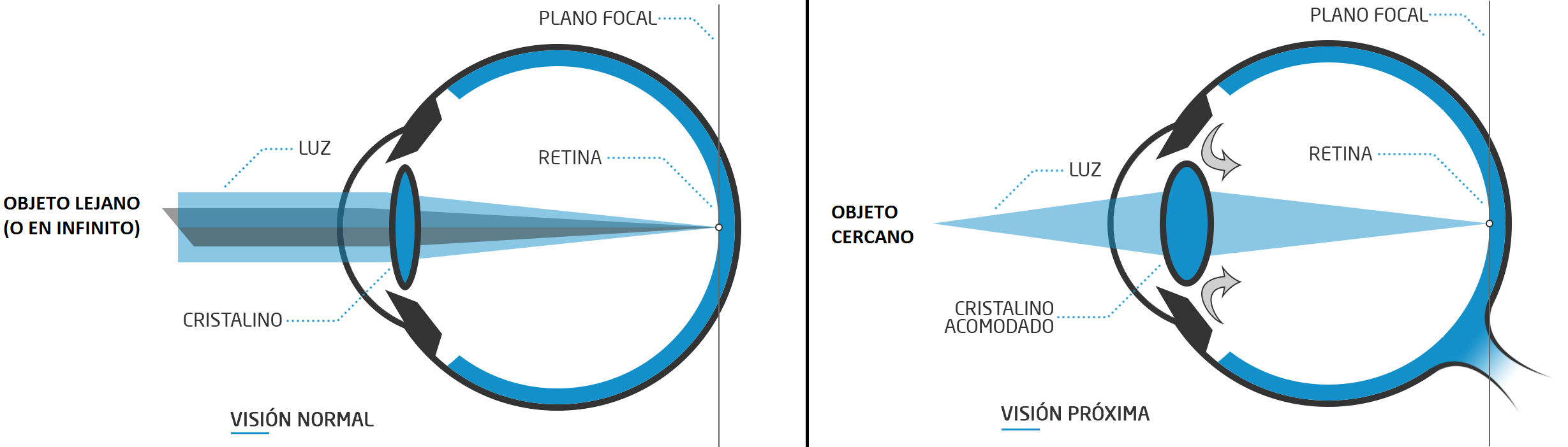 Como la córnea, el cristalino es una lente de estructura transparente, propiedad que se mantiene por la regularidad de las fibras elásticas de las células que lo componen. El índice de refracción del cristalino varía desde 1.406 en el centro a 1.386 a lo largo de la zona periférica (Rash y colaboradores, 2009). El musculo ciliar se compone de fibras de músculo liso, ubicadas en forma longitudinal, circular y radial. Cuando está relajado, aumenta la tensión del ligamento suspensorio del cristalino, esta lente toma su curvatura más plana y permite realizar un buen foco en objetos distantes. Cuando el músculo se contrae, la lente toma una forma redondeada que aumenta la capacidad de enfocar objetos cercanos.