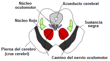 El mesencéfalo o cerebro medio es la estructura superior del tronco del encéfalo; une el puente troncoencefálico o puente de Varolio y el cerebelo con el diencéfalo. Su eje longitudinal se inclina hacia atrás y los flagelos se alejan de la línea media en su ascenso por el foramen de Pacchioni para penetrar en el hemisferio cerebral correspondiente. El límite con el puente troncoencefálico está bien definido, por el surco pontomensencefálico y el límite superior está determinado por las cintillas ópticas. Está atravesado por un conducto estrecho, el acueducto de Silvio (acueducto cerebral), por donde circula el líquido cefalorraquídeo desde el tercer hacia el cuarto ventrículo. Esta integrado por el TECTUM (techo) que se localiza en la porción dorsal del mesencefalo, y el TEGMENTUM (tegumento) que es la porción del mesencéfalo situada debajo del tectum. Incluye en su espesor varios núcleos que controlan los movimientos oculares: la sustancia gris periacueductal (constituida por cuerpos celulares de neuronas), el núcleo rojo, y la sustancia negra que son componentes importantes del sistema motor.